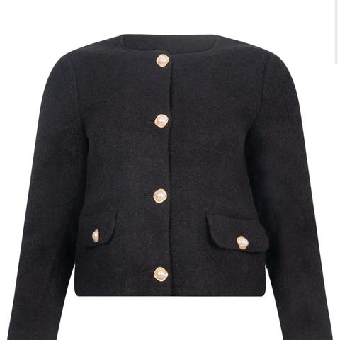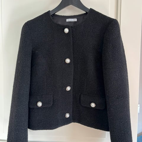 Stilig blazer i 46 prosent ull, ellers akryl og polyester. Jakken er kun brukt en gang, har ellers hengt i skapet. Størrelse 42. Selv er jeg 183 cm høy- med lange armer- se bilder for passform.