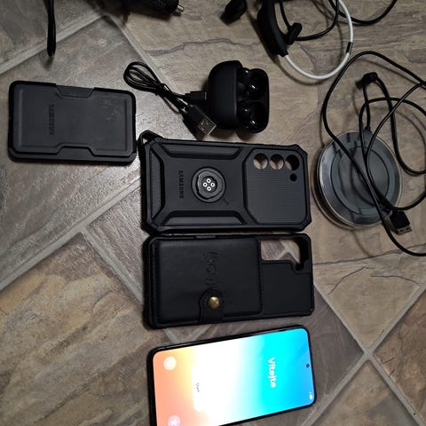 Samsung Galaxy S23 mobiltelefon med 128 GB lagringskapasitet. Inkluderer Samsung Galaxy Watch 8 (gps, LTE) og diverse tilbehør som hodetelefon, lader og deksler.