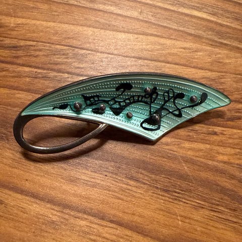 Dette er en vintage norsk modernistisk brosje i sterlingsølv med hvit emalje, sannsynligvis designet av anerkjente gullsmeder som Aksel Holmsen eller Hans Myhre. Slike brosjer dateres ofte til midten av århundret, rundt 1950- og 1960-tallet.