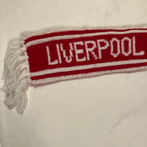 LFC skjerf i rødt og gult, laget av 100 % akryl. Skjerfet er produsert i Storbritannia og har frynser i gul farge. Kjøpt på Anfield.