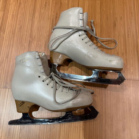 Hvite barneskøyter i størrelse 35/36. Skøytene er designet for annet skøytesporttype. Materialet og detaljer er tilpasset barnets bruk.