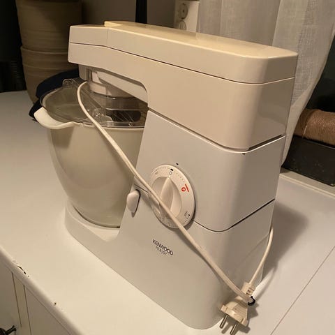 En Kenwood Major med masse ekstrautstyr. Følger med deigkrok, visp, og kenwood-kroken. Bakebollen er i plast.