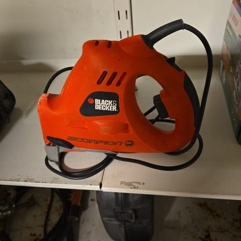 Black & Decker KX390E elektrisk stikksag med oransje og svart design. Verktøyet har ledning for strømtilkobling og er egnet for presisjonskutting i ulike materialer.