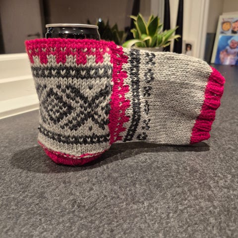 Ny og ubrukt Håndstrikket varmekoppetui laget av ull. Etuiet har et flerfarget mønster med røde, gule, grønne og oransje nyanser.
