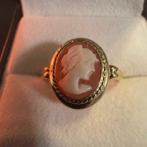 Authentic cameos are typically carved from natural materials such as shell, coral, or semi-precious stones like agate or onyx, which have contrasting layers of color. The material in your ring has a light, peach/cream-colored figure against a slightly darker orange-brown background, characteristic of a shell cameo, possibly a sardonyx or conch shell.