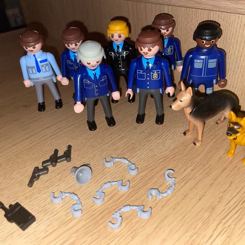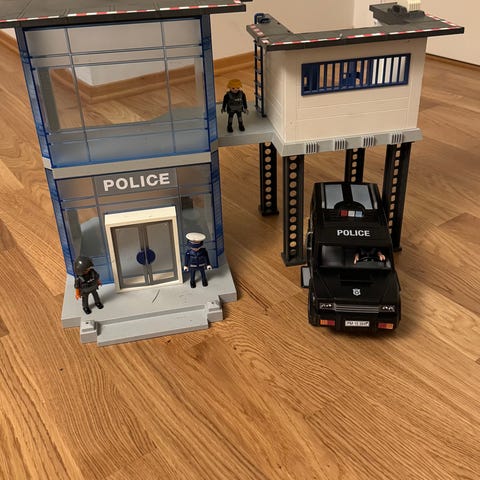 Kjekk politistasjon, med to poltibetjenter og utstyr som vist på bildet. Vest og hatt til å ta på tyven, men det medfølger ingen tyv. Veldig pent brukt.