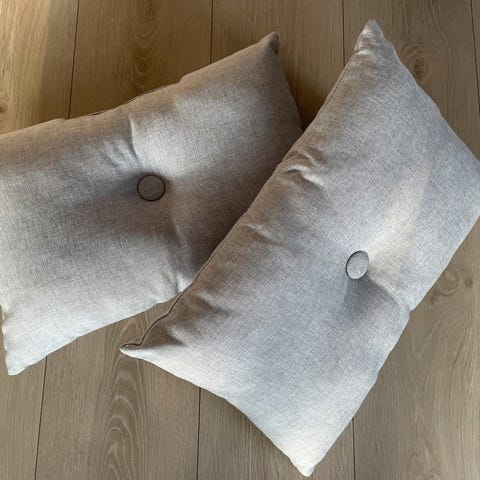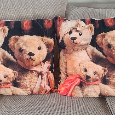 To krøllete pynteputer med saueskinnsimulering i beige farge.