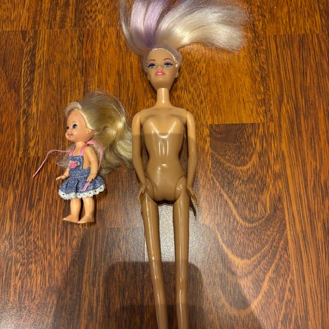 Barbie dukketøy bestående av bukser i turkis farge og en t-skjorte med mønster i blått, hvitt og oransje. Passer til ken-dukker.