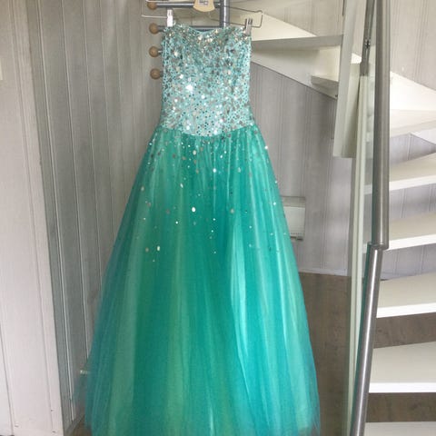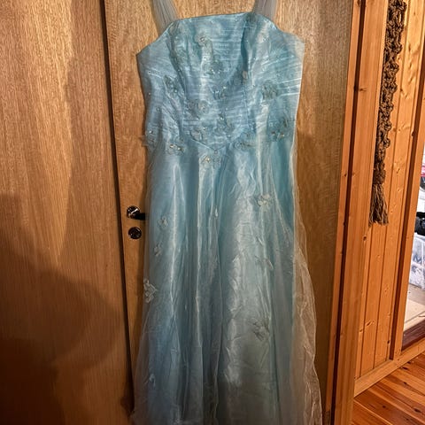 Kjole kjøpt på brude og selskapsklær butikk på Lillestrøm. Ble sydd inn noe og tilpasset høyde på ca 168/170 cm. Brukt på 2 10. klasse ball.