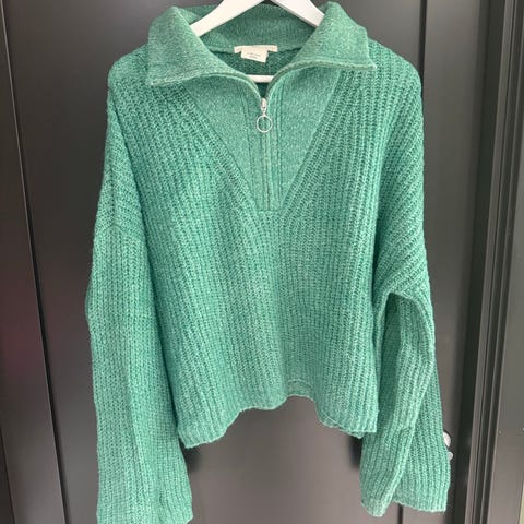 Behagelig genser i fine fargen, mye bruk igjen. Lappen i nakken er klipt bort,men ingenting å si for bruken.