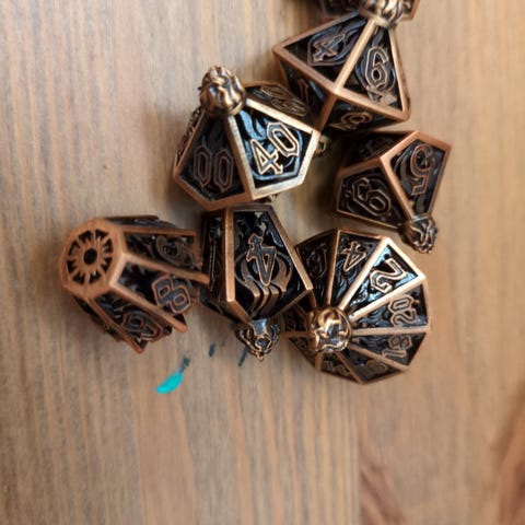 Flotte røde metall terninger som er hule inni. Høres ut som en pengepose når du ruller fler samtidig