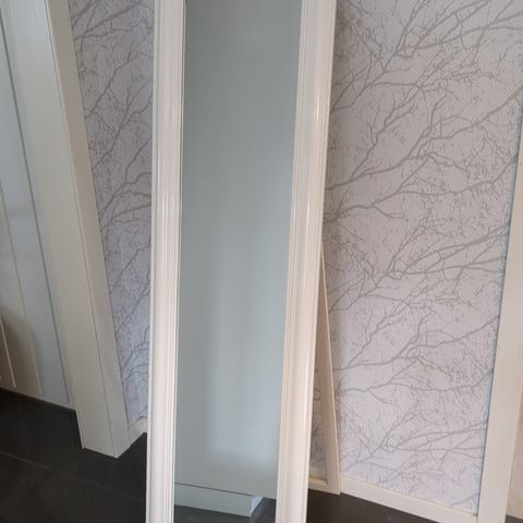 Selger et stilig speil som er stort nok til å stå på gulv og henges på vegg. Speilet er i god stand.