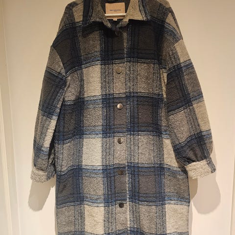 Jean Paul hvit/ psuli størrelse XL for kvinner. Jakken er laget i ullmateriale og har et flerfarget rutemønster.
