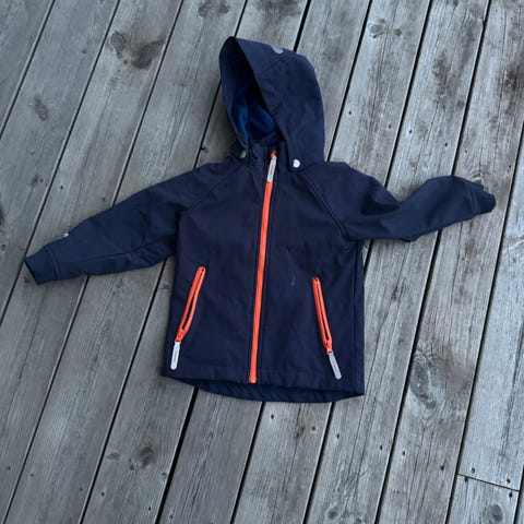 Guttejakkе i størrelse 110–116 cm, i god stand. På det ene ermet er det lette malingsflekker, ukjent hvor og når de oppstod.