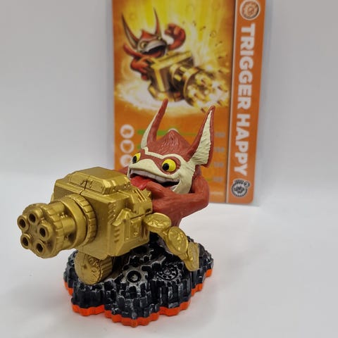 Skylanders Giants til PlayStation 3 med spill og fire figurer. Figurenes detaljer inkluderer en rød, en lilla, og to blå figurer med forskjellige våpen og egenskaper. Spillet leveres i original plastkassett med disk.