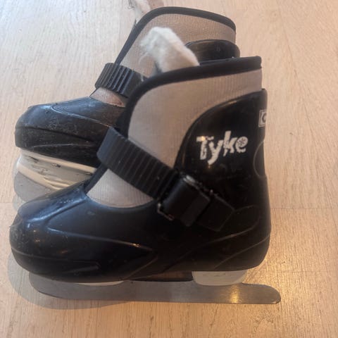 Ranger ishockeyskøyter for barn i størrelse 27. Skøytene er svarte med hvite lisser og har en hvit knivholder.