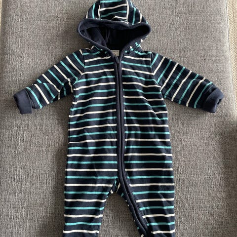 Myk dress i økologisk bomull til baby, med deilig collegekvalitet og børstet innside. Den lange glidelåsen fra hals til nederst på bena forenkler av- og påkledning og har en beskyttelse øverst for å hindre at den gnager mot hake og kinn. Dressen har ekstra lange vrangboder nederst på ermene og bena, som kan brettes ned etter hvert som barnet vokser.