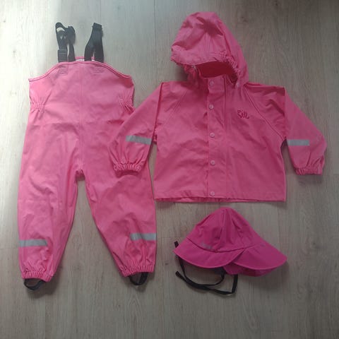 Regnsett 2 år xplore, brukt som ekstra sett, så derfor nesten ikke brukt. Jeg kan ikke se noen flekker/hull osv.