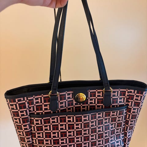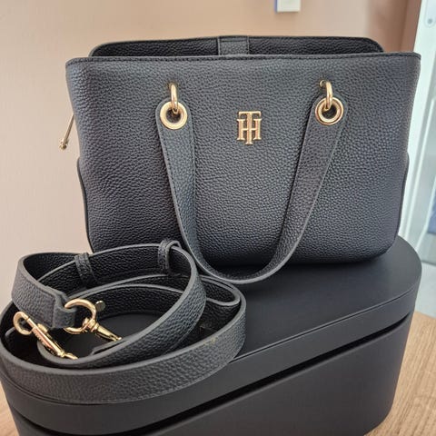 Tommy Hilfiger stoff veske for unisex bruk. Vesken har to håndtak og en avtagbar skulderrem. Designet med mørk blå stoff og brune detaljer i håndtakene. Passer til daglig bruk og har et enkelt, funksjonelt design.