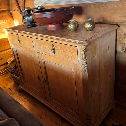 Skap 2 har en stor skapdør med større oppbevaring. Passer fint sammen på en hytte med trevegger.