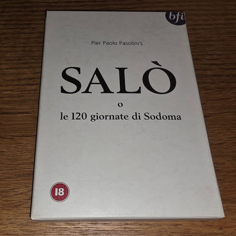 Pasolini Collection Salo DVD film. Innbundet DVD-utgave med original cover. Inneholder filmen 'Salo' med tilhørende informasjon på baksiden av omslaget. Produkt