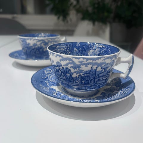 To stk. store og gode Twinings tekopper med skål, dekorert med bilde av Thomas Twining og Twinings shop in the Strand, London. Koppen rommer tre desiliter.