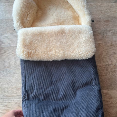 Pent og lite brukt vognpose med saueskinn fra Nøstebarn. Vannavvisende ytterstoff. Vi har hatt dunpose så denne har blitt nedprioritert og selges derfor. Kan ikke se noen spesielle anmerkninger utenom en flekk ved hullet til selen.