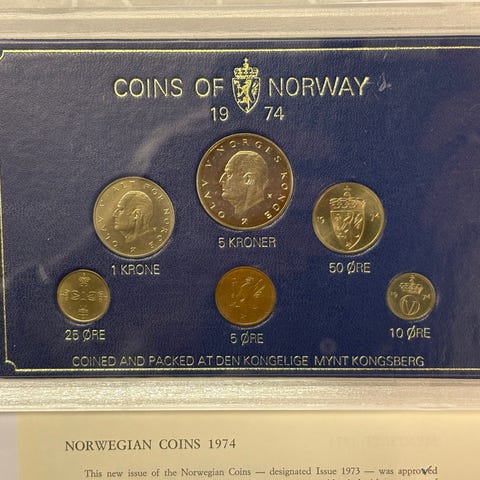 Coins of Norway 1975 myntsett med forskjellige valører inkludert 5 kroner, 1 krone, 50 øre, 25 øre, 5 øre, og 10 kroner. Selges til god pris Kr 500,- og nå videre ned til kr 400 + porto