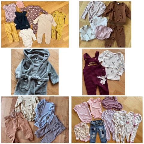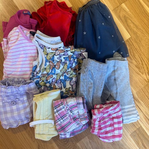 To kjoler, en cardigan, en t-skjorte, en slengbukse og to gensere. Alt lite brukt eller nytt.