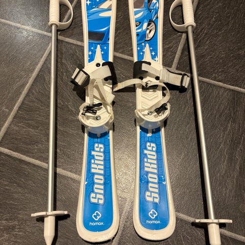 Pent og lite brukte barneski. Perfekte som barnets første ski. Brukes sammen med vanlige sko, slik St det ikke er behov for skisko. Se bilde for mer informasjon om skiene.