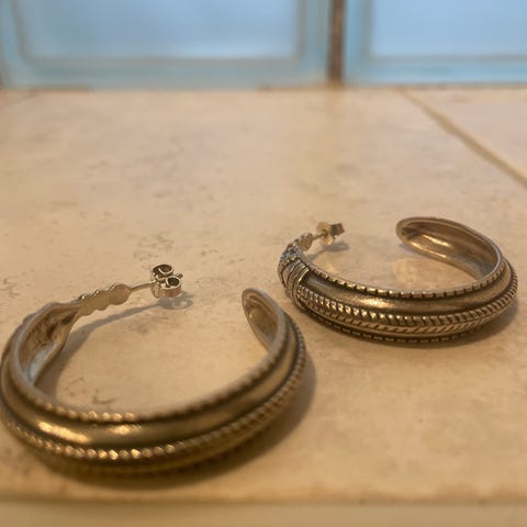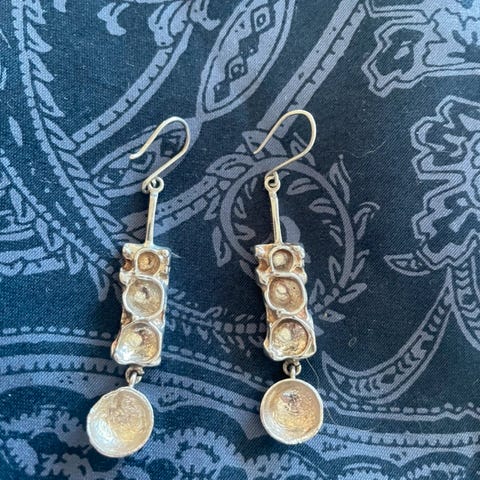 Ørepynt i sølv fra "Mjellesmykket" . Ørepynten er laget sterlingsølv med granat i senter. Akkurat som man finner på Mjelle.