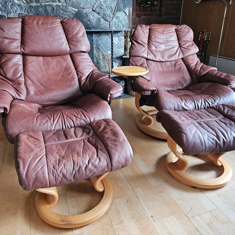 Stressless Classic lenestol med tilhørende fotskammel. Lenestolen og fotskammelen er trukket i sort skinn.