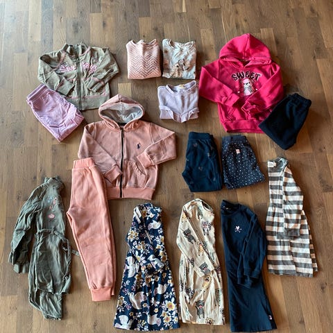 Fire kjoler, en joggedress og pensko str 26. Alt str 98/98/104. Lite brukt eller nytt. Joggedressen er tredd i en strikk i livet for stramming, kan enkelt tas ut (aldri brukt).