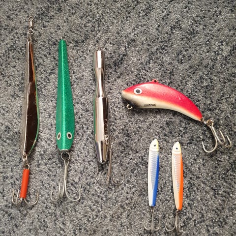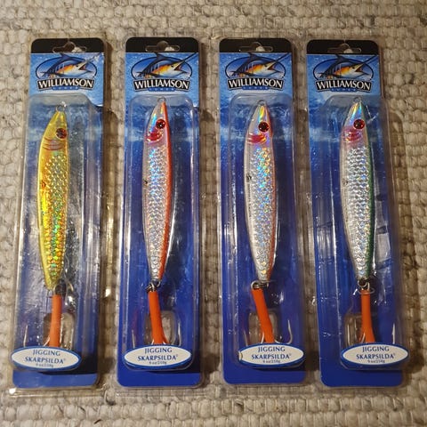 Selger samlet 6 sølvblanke pilker til havfiske, rigget med splittringer, treblekroker og noen med fargerike blekkspruter, kevlar eller monofortom. Flere av krokene er nye. De to letteste pilkene har selvlysende slange på kroken. De tyngste pilkene er spesielt godt egnet ved mye vind/strøm eller på dypere vann.