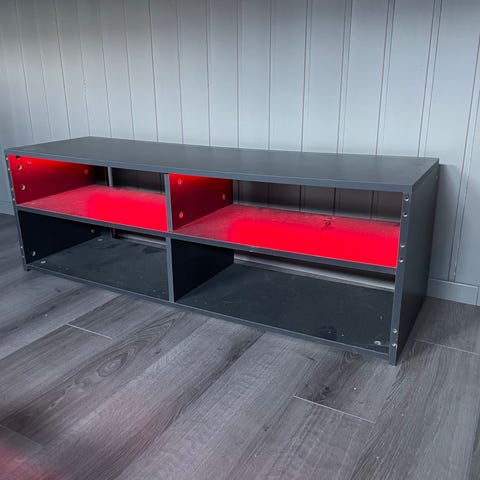 En stor og god tv benk, med plass til mye oppbevaring. To glass hyller i midten, der en kan sette pyntegjenstander eller ha tvboks. Tv benken er i god stand, men er noen bruksmerker rundt om.