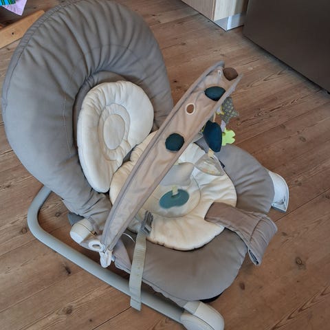 Elektrisk vippestol med nyfødt innlegg. Har musikk, vibrasjon, og man kan stille inn vippevinkel og tid. Se siste bildet for alle funksjoner. Trekket kan tæs av og vaskes i maskinen. Bildet er tatt med beina ved siden av stolen, de står litt vidt på hverside når montert.