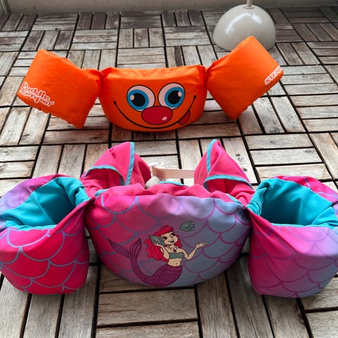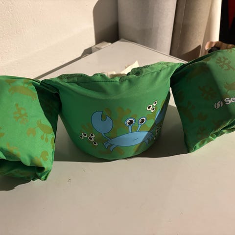 Flytevesten består av en sammenhengende brystdel og armdeler som gir god oppdrift og stabilitet i vannet. Enkel å ta av og på, og sitter godt på barnet.