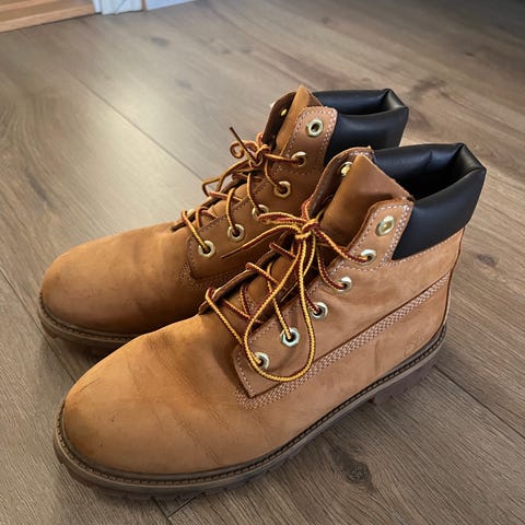 Timberland beige støvler i skinn med snøring foran. Støvlene har en høy modell som dekker leggen.