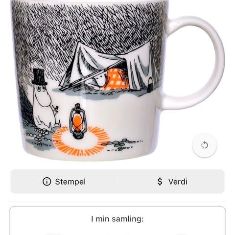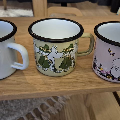 2 stykk Mummikopp i emaljert metall, sett med 2 kopper i forskjellige farger med Mummitrollet-motiv. Koppen har svart kant rundt åpningen og er egnet for daglig bruk. Lite brukt, kjøpt i Helsinki utenfor Tove Janssons hjem. Pris pr kopp