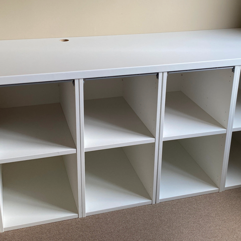 Stilig hyllesystem fra IKEA sin utgåtte PS 2014 kolleksjon. Selger fem hyller og fire hylleplater som fungerer som topplokk, alle i god stand og er pent brukt. Kan settes sammen på mange ulike måter.
