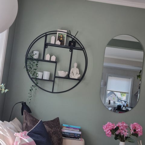 Bolia hylle i svart metall med firkantet ramme og sirkulær hylle. Passer til oppbevaring og dekorasjon. Mål er 80x80x 15 cm. Tung og solid hylle.