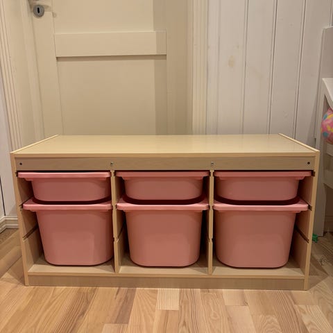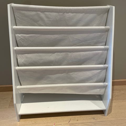 Jollyroom barneoppbevaringsmøbel med flere hyller og en stor skuff for oppbevaring. Passer til organisering av bøker, leker og andre barnerelaterte gjenstander. Møbelet er designet for bruk i barnerom. Skuffeskinnene er ødelagte da de var laget av plast, men de kan byttes ut. Skuffen kan brukes som vannlig. Må hentes.