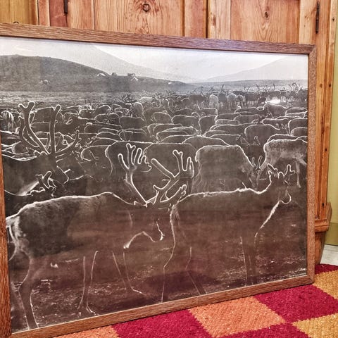 Ramme: 78 cm lang, 35,5 cm brei og 3cm djup. Ramma er heil og fin, to små nagg oppe i gull lista på høgre hjørne