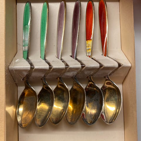 Selger 2 stk. Aksel Holmsen sukkerklyper sølvtopp med emalje, 21 cm. Grønn på bildet er solgt