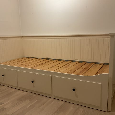 Selger brukt Hemnes seng. Sengen er uttrekkbar og kan benyttes som enkeltseng, dobbelseng og sofa. Tre store skuffer for oppbevaring.