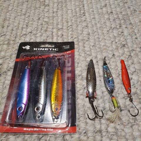 Selger samlet 11 varierte pilker til havfiske, rigget med splittringer, treblekroker og noen med fargerike blekkspruter. Flere av krokene er nye.
