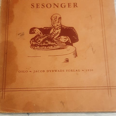 Maten vi spiser, en historisk matbok fra 1945 og fram til vår tid. Nils Harald Moe. Signert av forfatteren. Har vært bokbind på, så litt avrivning fra perm pga tape. 75 kr pluss frakt