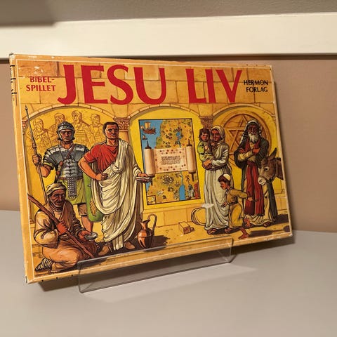 Hermon Forlag Jesu Liv brettspill med spillbrikker, kort, terning og spillbrett. Passer for 2-6 spillere i alderen 5-99 år. Spillet er designet av Trygve Wikstøl og Kvale Rue og produsert i Norge i 1989.