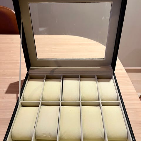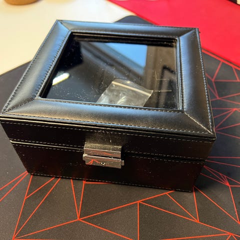 Perfekt skrin for 3 klokker. God oppbevaring og godt utseende. Laget av lett tre materiale med myk side utenpå for komfort. Skikkelige puter inni og metall fester.