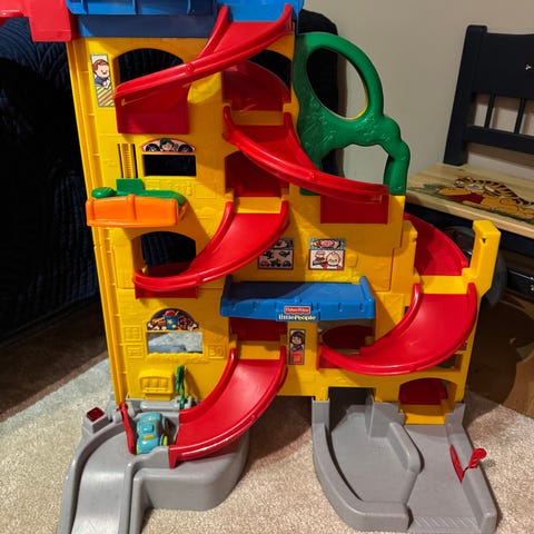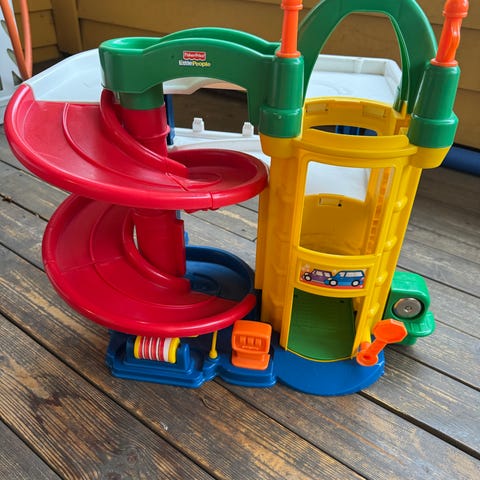 -Stort og solid lekesett, 30 cm høyt og 54 cm langt. Du kan bruke heis, bilvask, fylle tanken, eller kjøre på bilbanen.